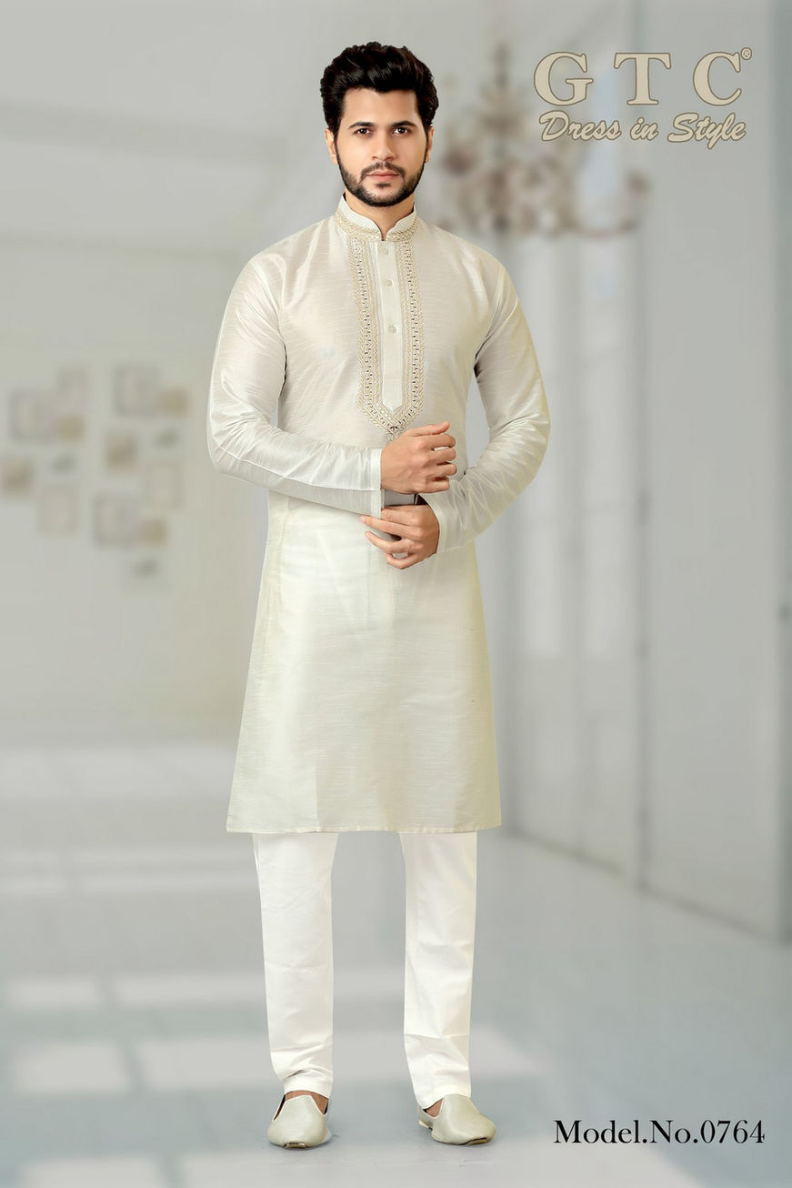 Classic and elegant, this Off-White Kurta from GTC Dress In Style offers a pure and peaceful appeal. Fabricated on premium dupion, it features delicate embroidery on the chest and around the neck, perfectly paired with a sleek white chudidar. Ideal for those who desire a timeless look, this ensemble stands out in sophistication. Customization options available for design style and color scheme to suit your personal taste. Elevate your wardrobe with this exquisite piece today.