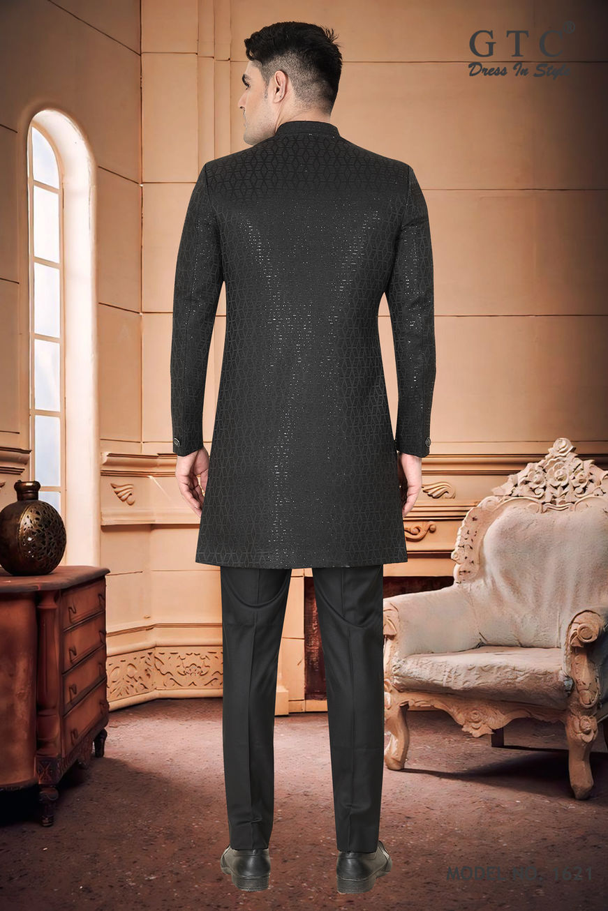 Upgrade your wardrobe with the 1621 Indo-Western Sherwani from GTC Dress In Style. Ideal for weddings, ceremonies, fashion shows, and pageants, this sophisticated sherwani is made from luxurious black silky jacquard fabric and paired with formal black pants. It blends traditional and modern fashion, showcasing exceptional craftsmanship and style.