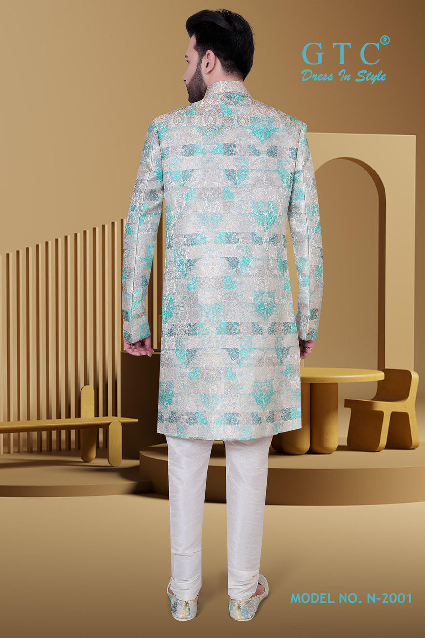 Show your love for art with the GTC-Nawabi Sherwani handcrafted on Silky Jacquard fabric. It features a classic straight cut with unique colors, exuding elegance and tradition. Paired with a white churidar and matching mojdi, this ensemble showcases timeless craftsmanship and sophistication. At GTC Dress In Style, we value exquisite designs that reflect individuality and cultural richness. Embrace refinement and make a statement with this exceptional piece.