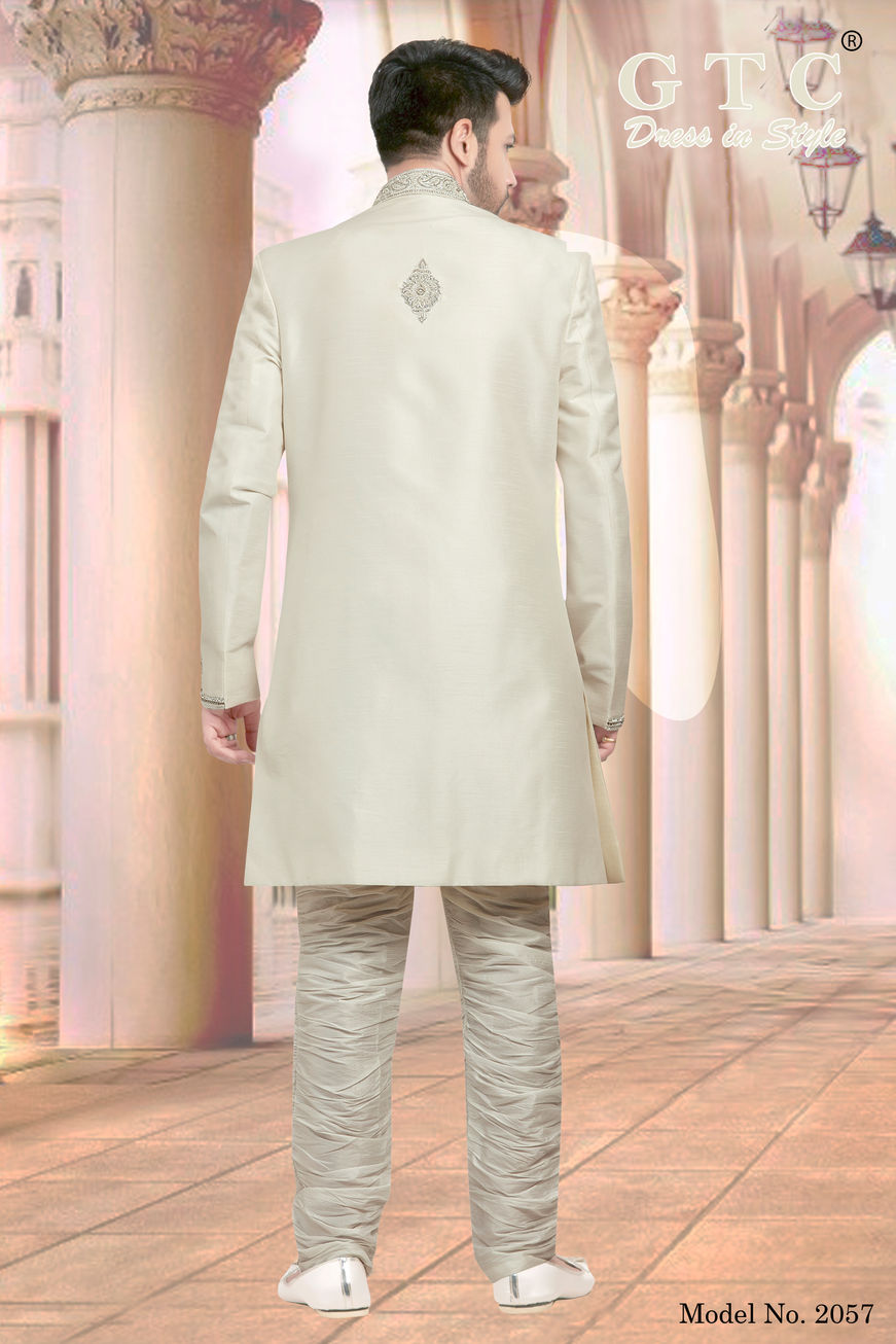 Experience timeless elegance with our GTC-Classic Sherwani, blending trends and tradition. Made from luxurious Banarasi Dupion Silk, it features delicate hand-beaded details on the collar, front, sleeves, and back. The asymmetrical cut and rakish design epitomize refined sophistication. Paired with a white brijis, it merges modern style with classic aesthetics. Elevate your wardrobe with GTC Dress In Style.
