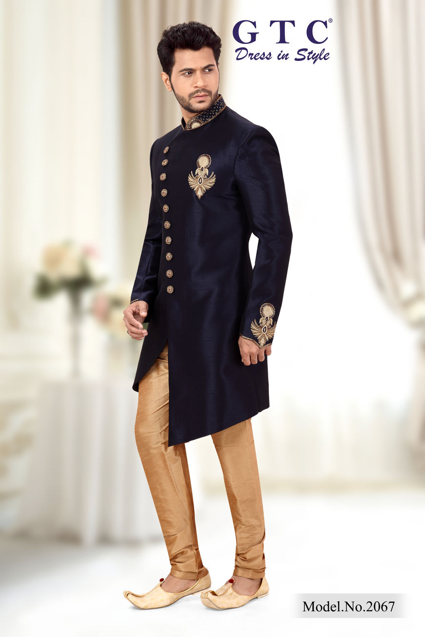 Update your wardrobe with the GTC-Classic Sherwani in Banarasi Dupion Silk. Adorned with hand-beaded work on the collar, front, sleeves, and back, its modern cut and elegant design offer a regal look. Paired with a gold churidar, it adds sophistication to any occasion. Elevate your style with GTC’s exquisite craftsmanship.