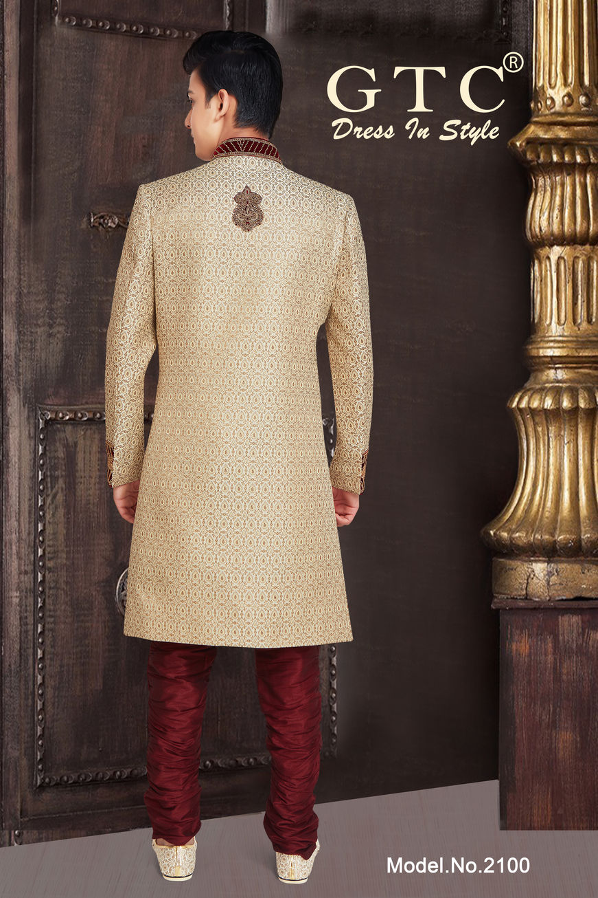 This kingly GTC- Classic Sherwani promises to keep all eyes on you on your special wedding day. Crafted from luxurious Jacquard fabric, it features pure regal hand-beaded work in a uniquely stylized supreme design with traditional wedding colors. Paired with a dark maroon brijis and matching loafer mojdi, this ensemble exudes elegance and sophistication. At GTC Dress In Style, we pride ourselves on providing timeless pieces that uphold our commitment to craftsmanship and quality. Make your wedding unforgettable with this exquisite sherwani.