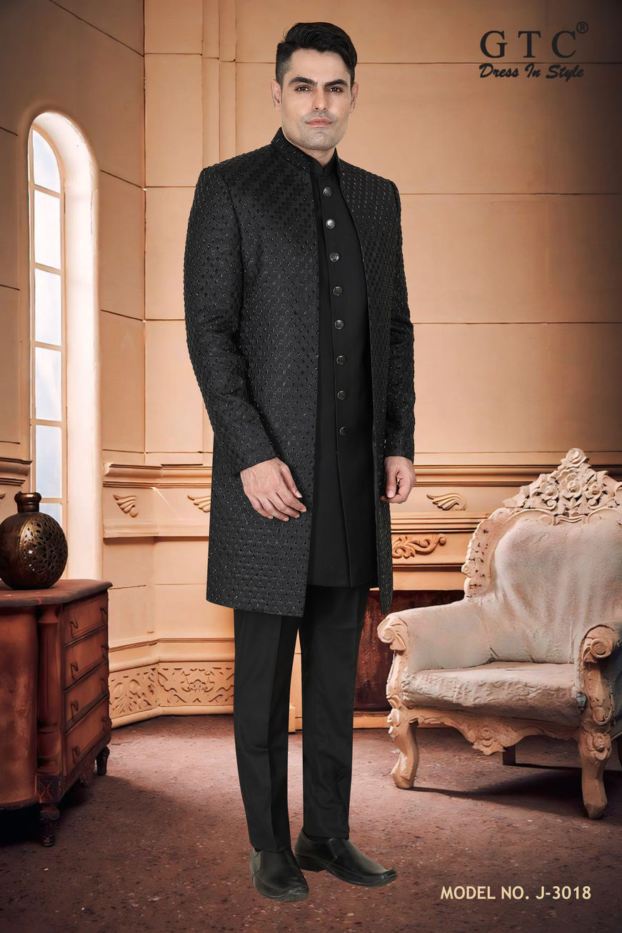 Unveil a regal charm with our 3018 JS at GTC Dress In Style! This Designer Jacket Sherwani, crafted from luxurious Silky Jacquard and Imported TR Suiting fabric in sophisticated black, ensures you make a statement at any event. Whether it's a Mehndi-ceremony, Sangeet-ceremony, Wedding, Fashion-show, Engagement-ceremony, Reception-ceremony, or Pageant-competition, the exquisite japanees cut dana Hand-beaded Work adds an unmatched elegance. Paired with Black Formal Pants, this ensemble stands as a beacon of style and tradition. Step into the spotlight with sophistication and grace!