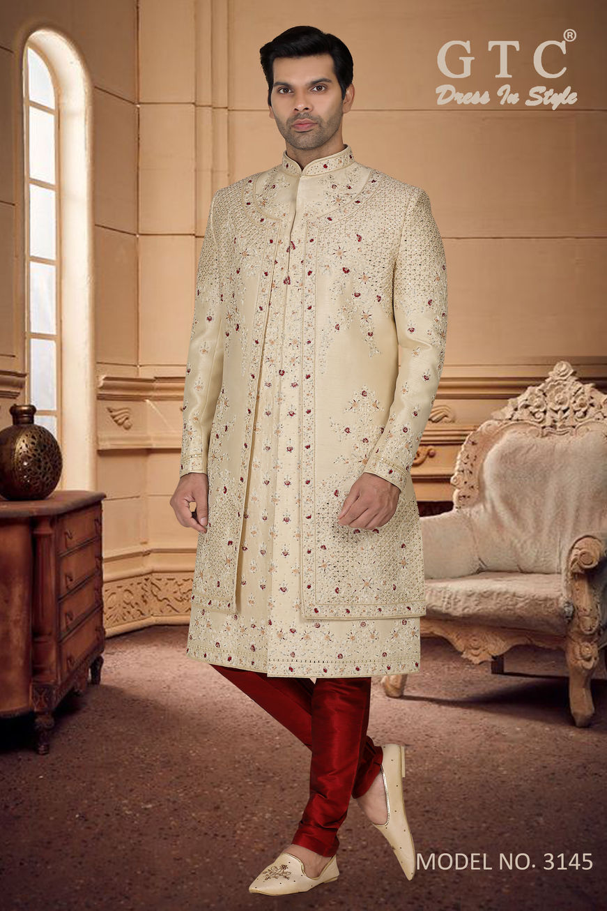 Experience unparalleled elegance with our Designer 4 Palla Sherwani, exquisitely crafted from luxurious Mono-Silk available in Cream, Maroon, Peach & Silver. Perfect for weddings, fashion shows, engagement ceremonies, reception ceremonies, and pageant competitions, this Sherwani features intricate embroidery and hand-beaded work, making it a masterpiece of refined craftsmanship. The ensemble is completed with a maroon churidar, ensuring a regal and cohesive look. At GTC Dress In Style, we believe in delivering sophistication and tradition, ensuring you look your best for every special occasion. Indulge in the timeless allure of this Sherwani and make a lasting impression.