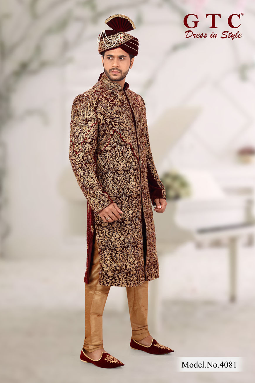 Go classic & traditional yet along with the trends at your wedding with this magnificent GTC-Exclusive & Wedding Sherwani finely designed on Dark Maroon Velvet fabric. The majestic embroidery and pure regal hand-beaded work on the front and back panel are finely detailed with intricate designing to make a remarkable statement when you don it this special day. At GTC Dress In Style, we pride ourselves on delivering exceptional craftsmanship that speaks volumes. Elevate your wedding attire with this luxurious Sherwani, ensuring you stand out with timeless elegance and modern flair.